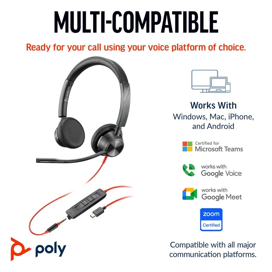 HP Poly Blackwire 3325 Stereo Microsoft Teams Certified USB-C Headset +3.5mm Plug +USB-C/A Adapter